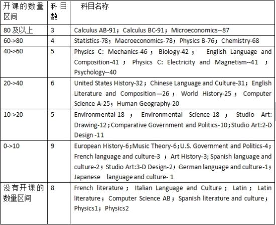 留學美國的學生日趨增加,AP課程學習者,AP考試參加者也越來越多。為了讓大家更清楚AP學校在中國地區的發展狀況,漢通根據美國大學理事會官網數據及中國地區開設AP學校的情況制作了2014-2015年版AP報告。 一、 中國地區開設AP國際課程學校 1.1按授權時間 圖1 分析: 從圖1中可以看出,2010年之前,中國地區的AP學校以每年10所左右的速度增長;2011年之后,增長速度為每年20多所。這表明AP課程在中國地區的發展增長趨勢明顯。 2014年中國地區的所有AP授權學校為139所,較去年增加了25所。 1.2.按地域 圖2 分析: 1.北京地區的AP學校是數量較大的,占到總學校的17%;其次是上海、成都、深圳。 2.AP學校地區分布廣泛,除了北京,其他地區分布數量相對平均。 二、 中國地區開設AP課程設置分析 2.1.按AP課程六類每類開課數量分析 圖3 圖4 圖5 圖6 圖7 圖8 分析: 1. AP課程藝術類:Studio Art: Drawing 和Studio:2-D Design開設的學校數目遠多于其他課程;較少的是Studio:3-D Design。 2. AP課程歷史及社會科學類:宏觀經濟學和微觀經濟學遠多于其他課程,漢通認為主要原因是中國地區學生在申請美國大學時,多選擇商科類的專業。 3. AP課程科學類:物理B和化學開設學校多于其他課程,并且開設學校數目相差不大;環境科學開設數目較少。 4. AP課程英語類的2門課程,英語語言與寫作開設的學校遠多于英語文學與寫作課程,漢通分析認為,英語文學課程對學生英語要求較高,同時對學校老師教學要求會更高。 5. AP課程數學和計算機組中,微積分AB,微積分BC和統計學開設學校較多,漢通分析認為中國地區學生對這3門課程比較擅長,能夠達到兌換大學學分的要求。 6. AP課程世界語言組中,中文語言和文化課程開設的學校遠多于其他語言,漢通分析認為這符合中國地區的地域情況;其他的語言:法語、西班牙語和德語為熱門實用的二外。 2.2.按單科開設數量統計分析 分析: 圖9 分析: 1. 開課較多的課程是微積分AB,微積分BC,微觀經濟學等幾門課程。全國共有139所學校的至少80所學校開設了以上幾門課程,即中國地區70%的AP學校開設了數學,經濟;其次為統計學、化學、宏觀經濟學、物理。 由此可見,中國學校除了開設中國學生較擅長的數理化3門以外,也開設了當下的熱門科目,如經濟,統計等金融相關課程。 2. 文科課程開設較少,藝術類更少。原因是中國學生學起來由于語言的問題,不是很容易。 3. 統計學、世界歷史等科目比去年多有所增加。 2.3.按照地域分析AP開課數目 圖10 分析: 從圖10中可以看出,學校開課數目較多的地區為:北京、上海、江蘇、廣東以及浙江地區,并且開設課程數目在10-20門之間。然而,其他地區不僅開設課程數目少,集中在0-10門。 三、 AP學校2014畢業情況統計 圖11 分析: 1. 上海地區AP學校畢業生平均人數較高,高于北京和其他地區,平均達到150多人。 2. 北京地區AP學校畢業生平均人數相對較低,為80多人。 四、AP考試分析 4.1.較容易和較難得5分的科目分析 圖12 較容易得5分的科目: 數學科學組為微積分BC; 英語歷史和社會科學組為心理學; 藝術和外語組為中文。 圖13 較難得5分的科目: 數學科學組為生物; 英語歷史和社會科學組為世界歷史; 藝術和外語組為實驗藝術:3-D。 4.2.較容易和較難得3分及以上的科目分析 圖14 較容易得3分及以上的科目: 數學科學組為微積分BC; 英語歷史和社會科學組為心理學; 藝術和外語組為中文。 圖15 較難得3分及以上的科目: 數學科學組為環境科學; 英語歷史和社會科學組為世界歷史; 藝術和外語組為藝術史。 (資料