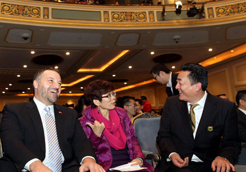 加拿大駐上海領事館總領事(左一)、加拿大不列顛哥倫比亞省國際貿易廳廳長屈女士(中)與楓華集團原宗董事長在慶典上交談。