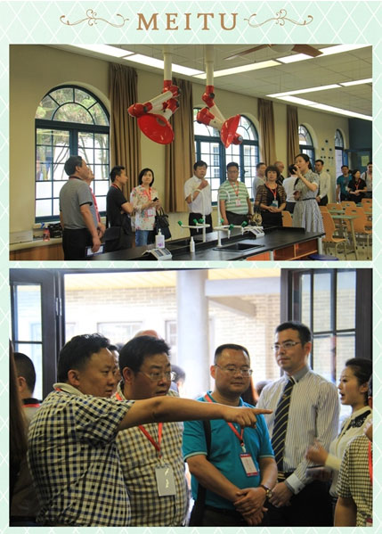 ——老師在向校長團演示化學實驗室的吸氣設置,隨后大家走進戲劇教室,對較好的教學設備驚嘆不已
