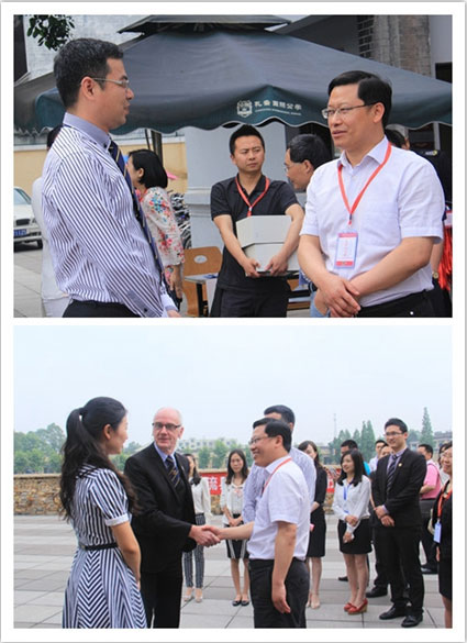 ——校領導給來訪團發送我校校徽,別看小小的校徽,可是凝聚著孔裔雙三元色的教學理念,意義非凡