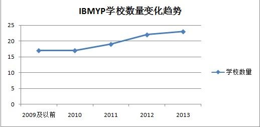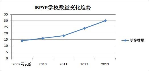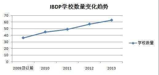 從圖中看出,IBDP課程學校一直保持較快增長趨勢,從2009年的30來所學校,以每年增長近10所的速度快速發展。這與IBDP文憑在全球的廣泛認可度以及完善的高中課程體系密切相關。