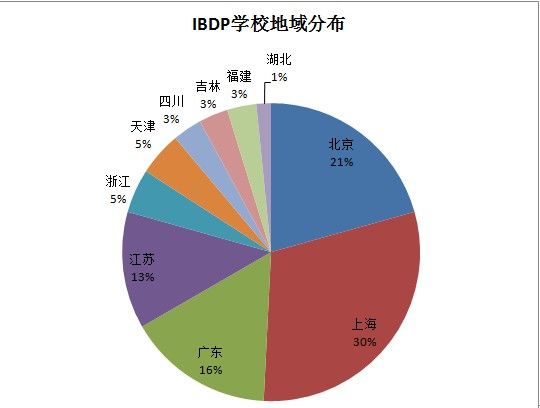 中國地區IB學校集中在上海、北京、廣東、江蘇四個經濟發達地區。占到總數目的80%,其中上海的較多,占全國IB學校的三分之一。