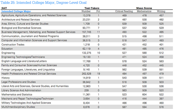 較后,部分考生關注的是一個小眾新興專業——多元/跨學科研究。僅有不到1%的考生報考,其SAT考試三個部分的平均分非常高,其中閱讀平均分(587分)和寫作平均分(576分)分別雄踞38個專業之首,數學平均分(594)屈居第二。究其原因,大概有如下兩點:其一,有實力開設多元/跨學科研究的大學幾乎都是較好大學,這個專業體現了學術較前沿,其要求本來就高,吸引的也都是處于較好位置的學生;其二,作為一名高中生,在選擇專業時就已經關注到多元/跨學科研究,說明學生本身對專業和學術的理解是超前和早熟的,無論是本人的研究旨趣,還是受家庭背景的影響,或是外部環境的刺激,這些學生獲取信息的能力和對學術的追求都超越正常水平,在整個學生群體中處于較好位置,其整體SAT分數高于平均值也就不足為奇。